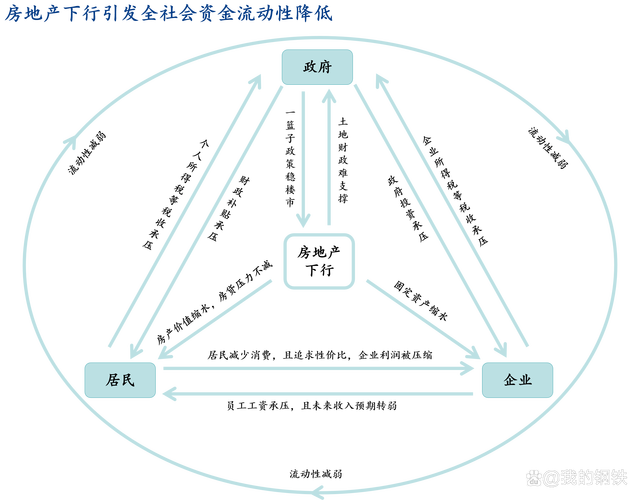 據(jù)前文所述,需求疲軟是物價低迷的表觀原因,深究則可能是消費者的資產(chǎn)負債情況惡化以及收入預期轉差:地產(chǎn)行業(yè)進入下行周期,房價的持續(xù)下跌一方面導致居民和企業(yè)的資產(chǎn)負債表惡化,縮減支出;另一方面也使財政收入承壓,疊加前期擴表的債務清償壓力,共同導致社會流動資金縮水。