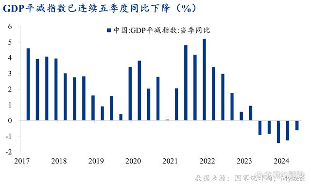 國內生產(chǎn)總值平減指數(shù)可以反映整體經(jīng)濟價格水平,該指標自2023年二季度起,至今年二季度已連續(xù)五個季度同比下降,市場擔心該指標可能將下降延續(xù)至2025年,這將創(chuàng)下中國自1993年數(shù)據(jù)開始以來最長的通縮記錄。
