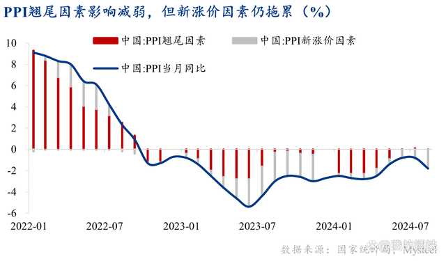8月CPI受農(nóng)產(chǎn)品供給波動推高,而非食品尤其耐用消費品價格低迷,暴露出實際消費需求的疲軟。PPI持續(xù)下滑也顯示供應大于需求的矛盾和外需見頂?shù)膿鷳n。GDP平減指數(shù)自2023年二季度起已連續(xù)五個季度同比下降,市場開始擔憂該指標的通縮壓力會延續(xù)至2025年。